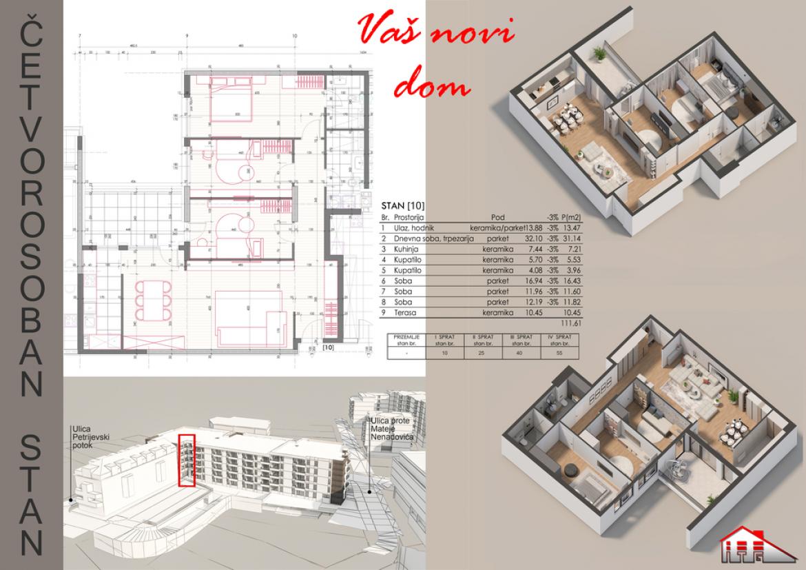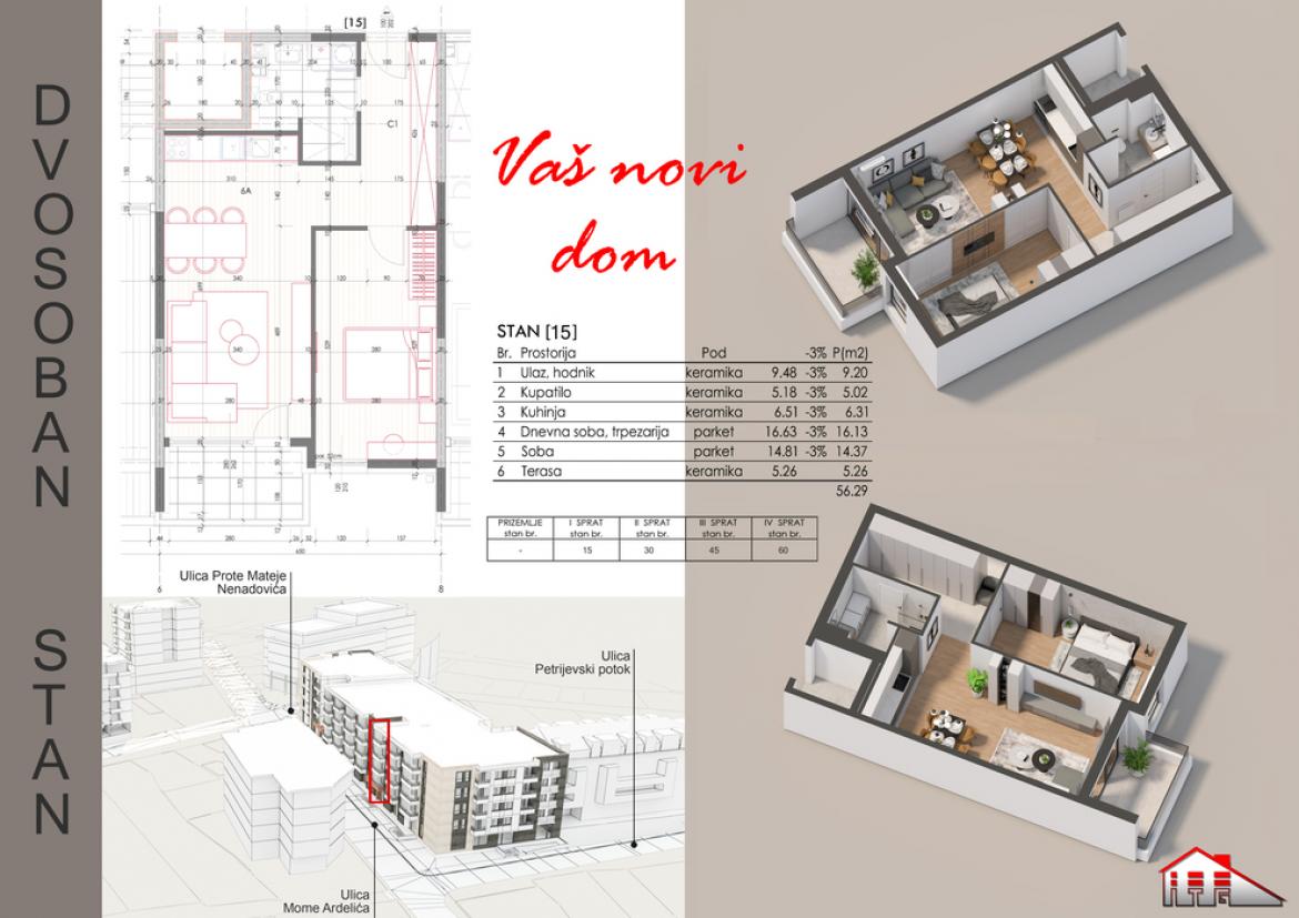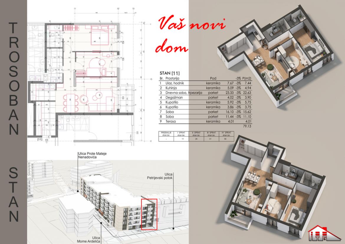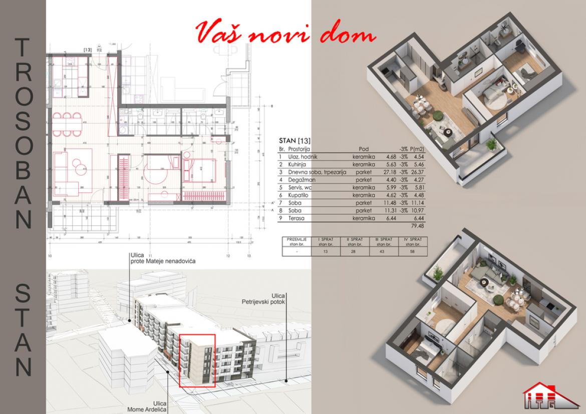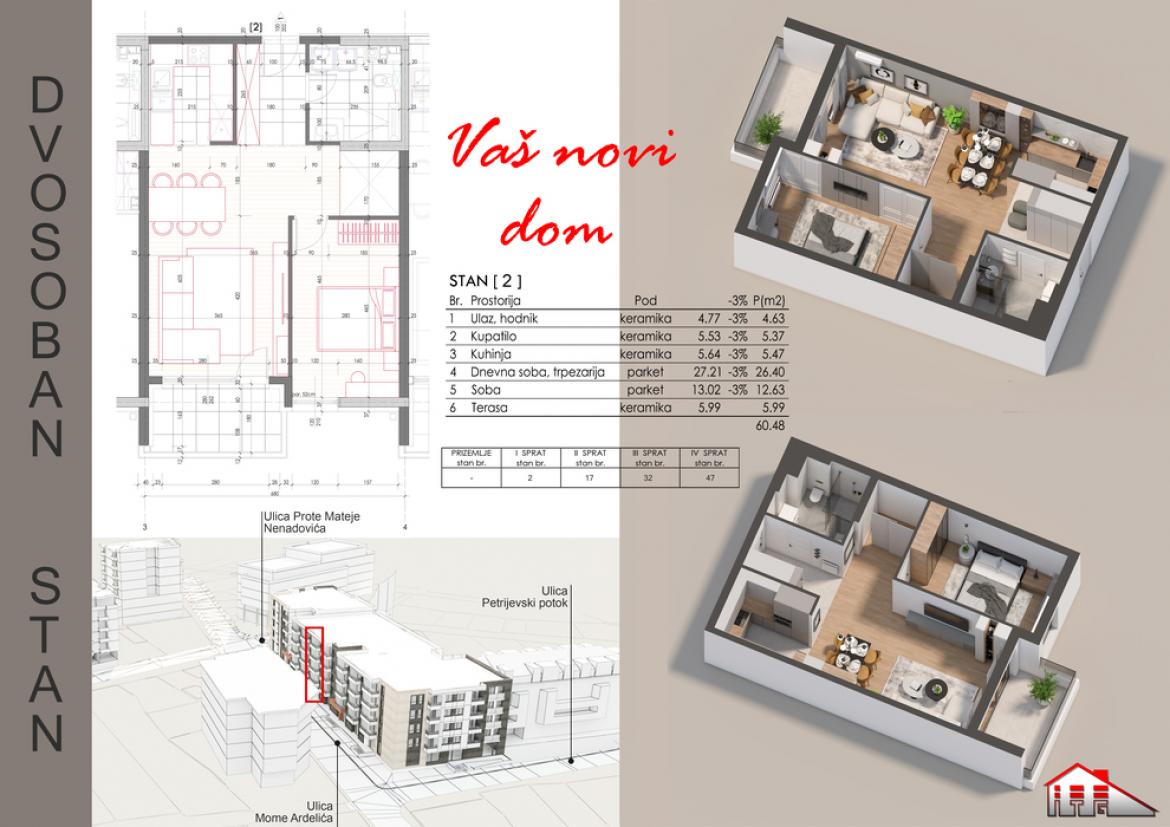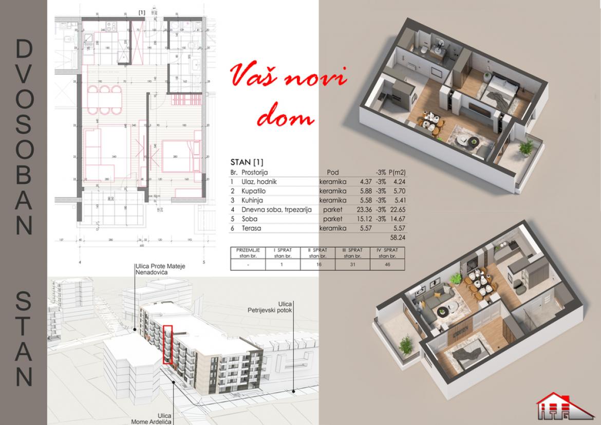 The construction of the residential and commercial building is taking place in 2 phases, with 2 adjacent buildings facing 3 central streets in Smederevo: Petrijevski Potok, Mome Ardelica, and Prote Mateje Nenadovića. Phase 1, currently under construction, includes 60 apartments and 10 retail units on the ground floor, with an underground garage. Completion of works is expected by the end of 2026.